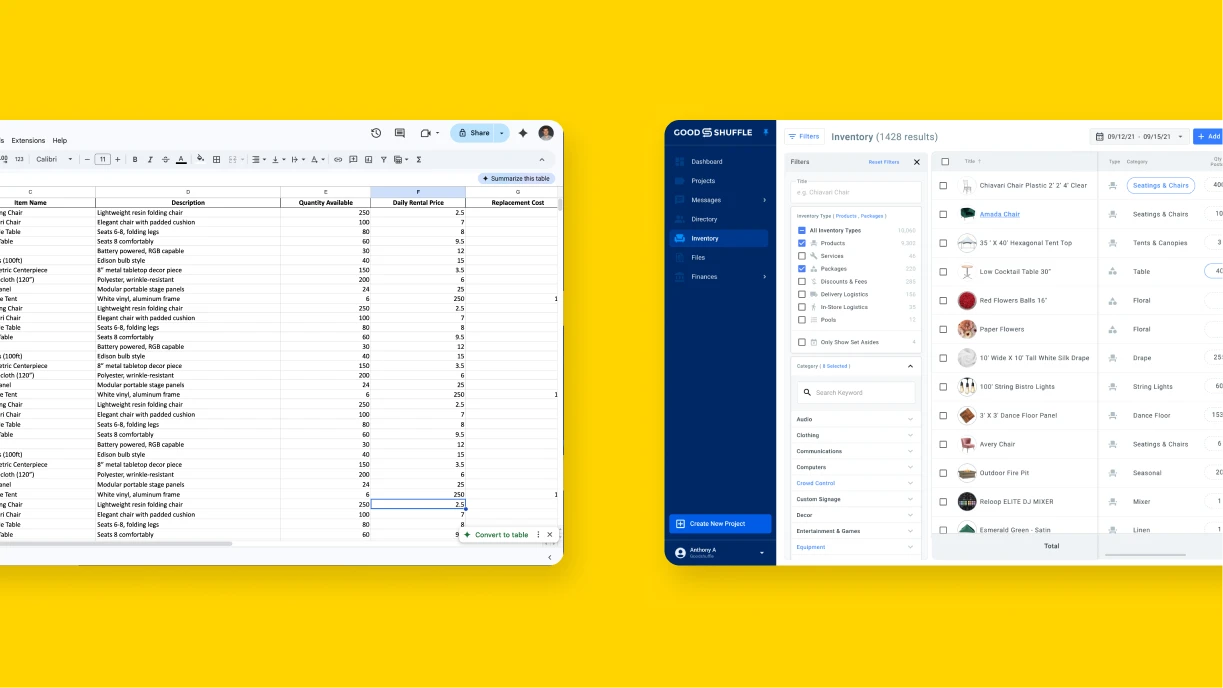 Pro Tip: With Goodshuffle Pro’s Website Integration, you’ll not only wow clients with a sleek online shopping experience, but you’ll also cut down on the time you spent on web maintenance — by as much as 95% — because all of your inventory items and packages are automatically synced with your website. Learn more about how Cam Petty, Owner & CEO of Render Events, did just that here.